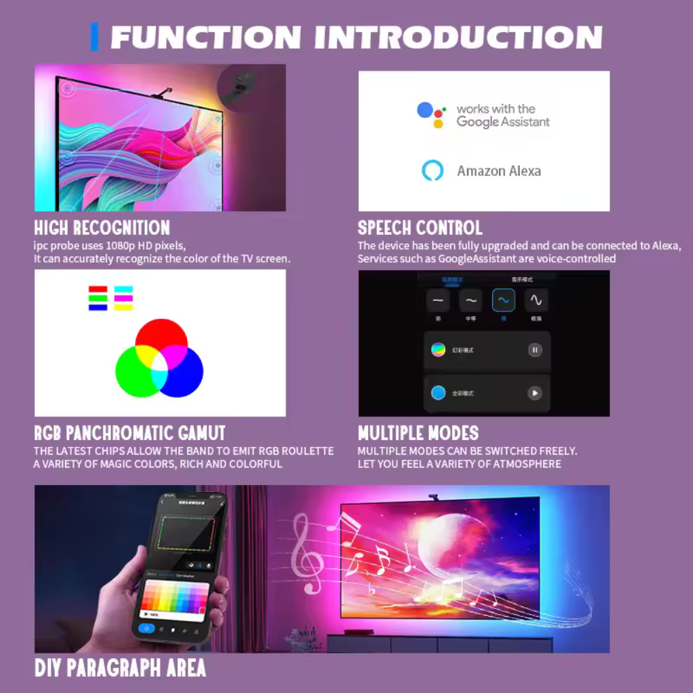 Transforma la configuración de tu televisor con iluminación inteligente que se adapta a tu pantalla y música. Crea fácilmente el ambiente perfecto para cada ocasión.