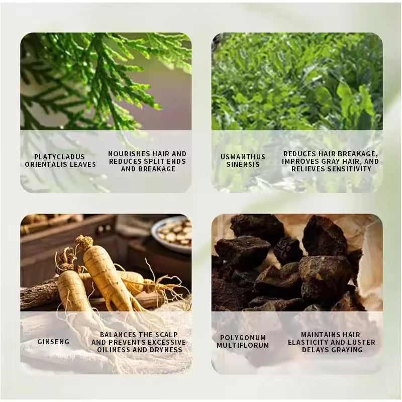 Blends of Eastern Herbal Medicine and modern Western trichology. Ingredients like He Shou Wu, Ginseng, and Platycladus Orientalis are time-tested botanicals shown to nourish scalp circulation and root strength.